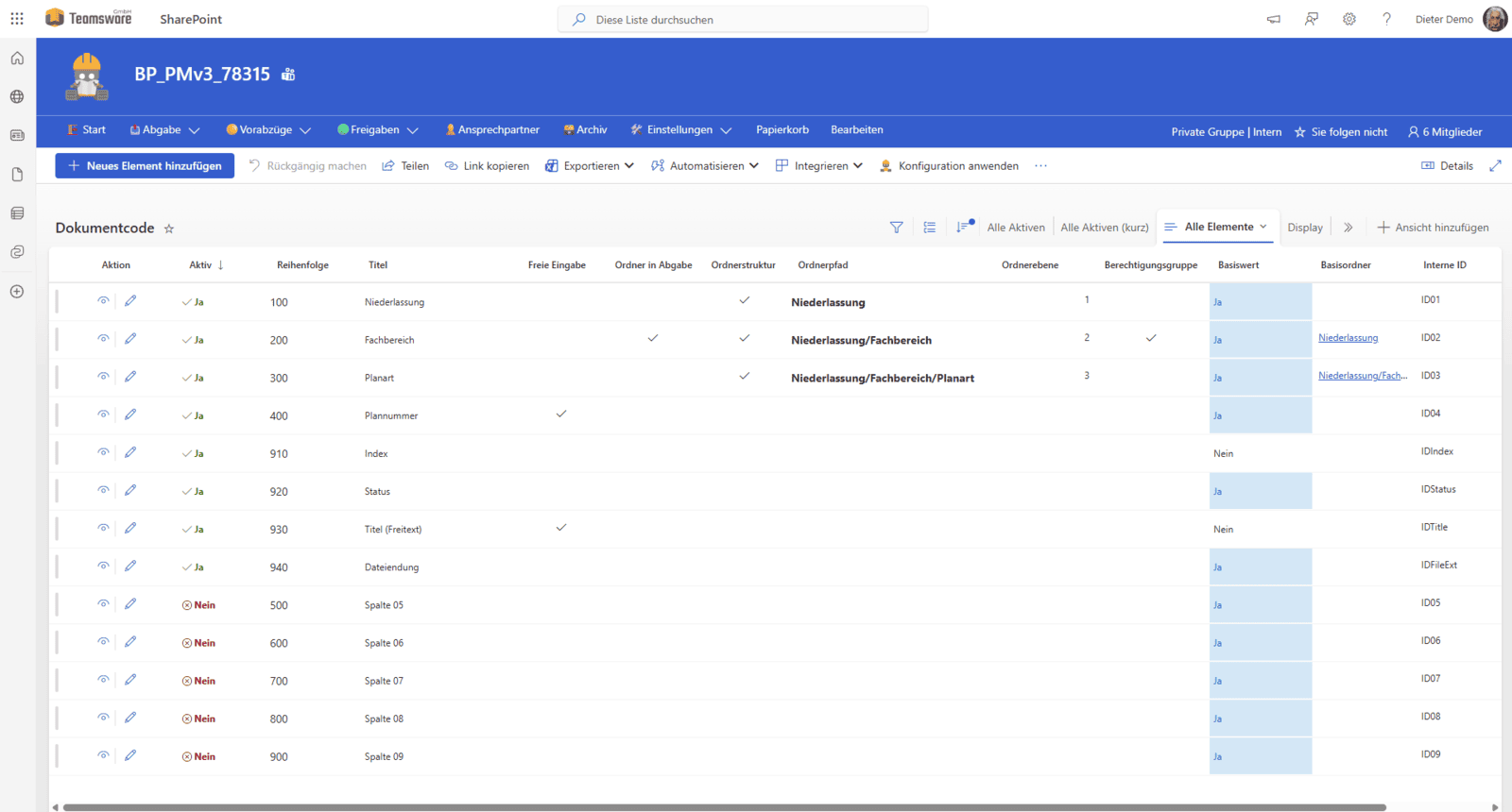 Mit der automatischen Plankodierung definierst du eigene Namenskonventionen, die das System beim Hochladen automatisch prüft. Du legst fest, wie Plannummern aufgebaut sein müssen, welche Indexe erlaubt sind und welche Planarten existieren. Fehlerhafte Pläne werden sofort erkannt und können nicht in die Freigabe wandern.