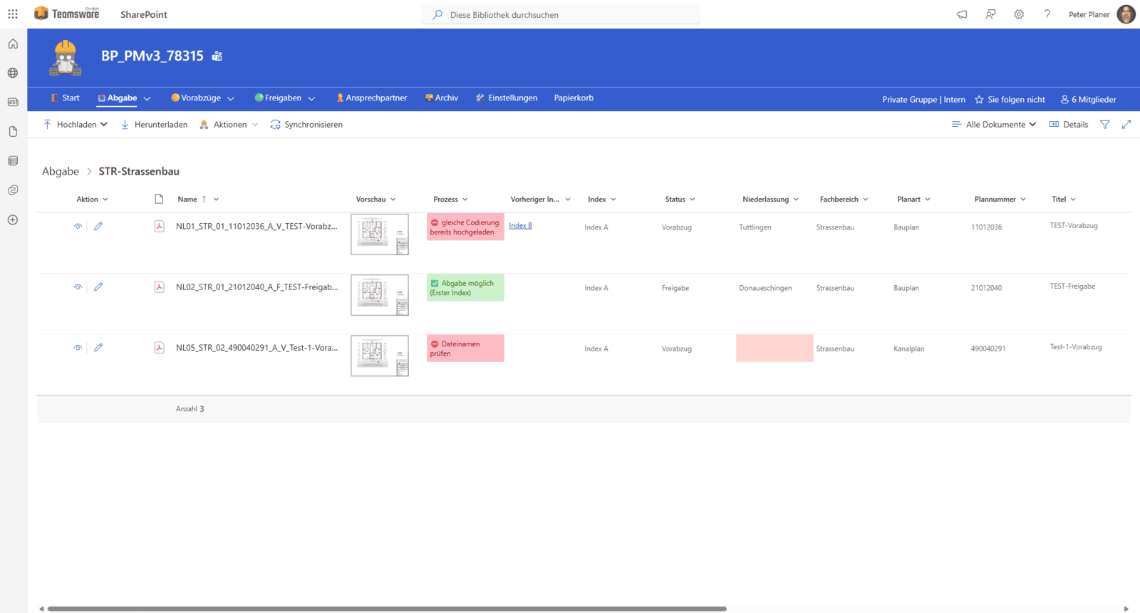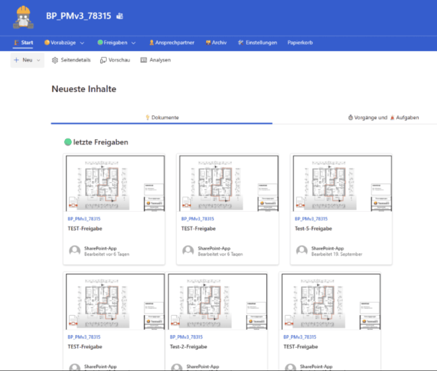 Jeder Beteiligte hat seinen persönlichen Abgabebereich für strukturierte Planabgaben. Nachunternehmer und Fachplaner können ihre Pläne in ihren eigenen Bereich hochladen. Die Pläne werden dort zunächst geprüft, bevor sie in die offizielle Planverwaltung übernommen werden.