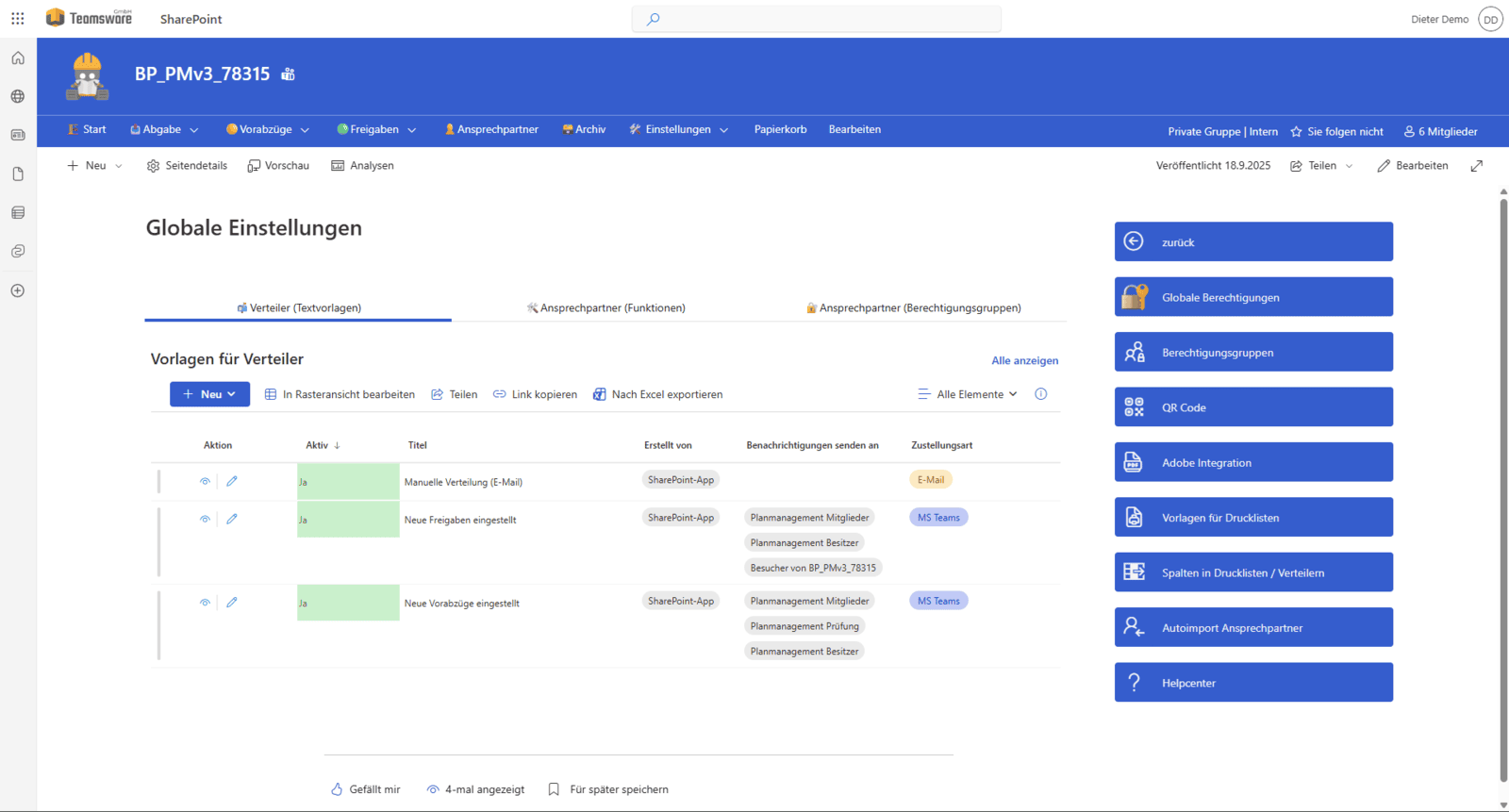 Die nahtlose Teams- und SharePoint-Integration bedeutet, dass du dort arbeitest, wo du bereits bist. Keine neue Software, keine Umgewöhnung – das Planmanagement fügt sich als natürliche Erweiterung in Microsoft 365 ein. Alle Funktionen sind direkt aus Teams oder SharePoint erreichbar.